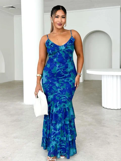 Fashion Backless Sleeveless Slim Elegant Floral Pleated Maxi Long Dress