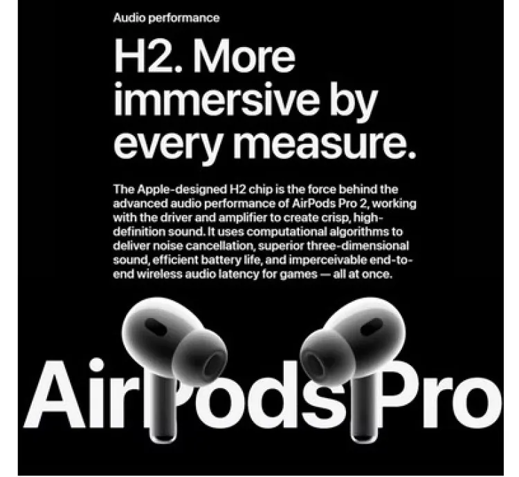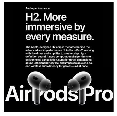 Groundbreaking audio performance - Apple-designed H2 chip, the force behind AirPods Pro, pushes advanced audio performance even further. From smarter noise cancellation to superior three-dimensional sound and battery life, it improves on the best features of AirPods Pro in a big way.