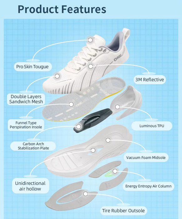 carbon fiber plate unit embedded in the arch of the foot offers stability and support, while the vacuum foam midsole provides a soft landing and