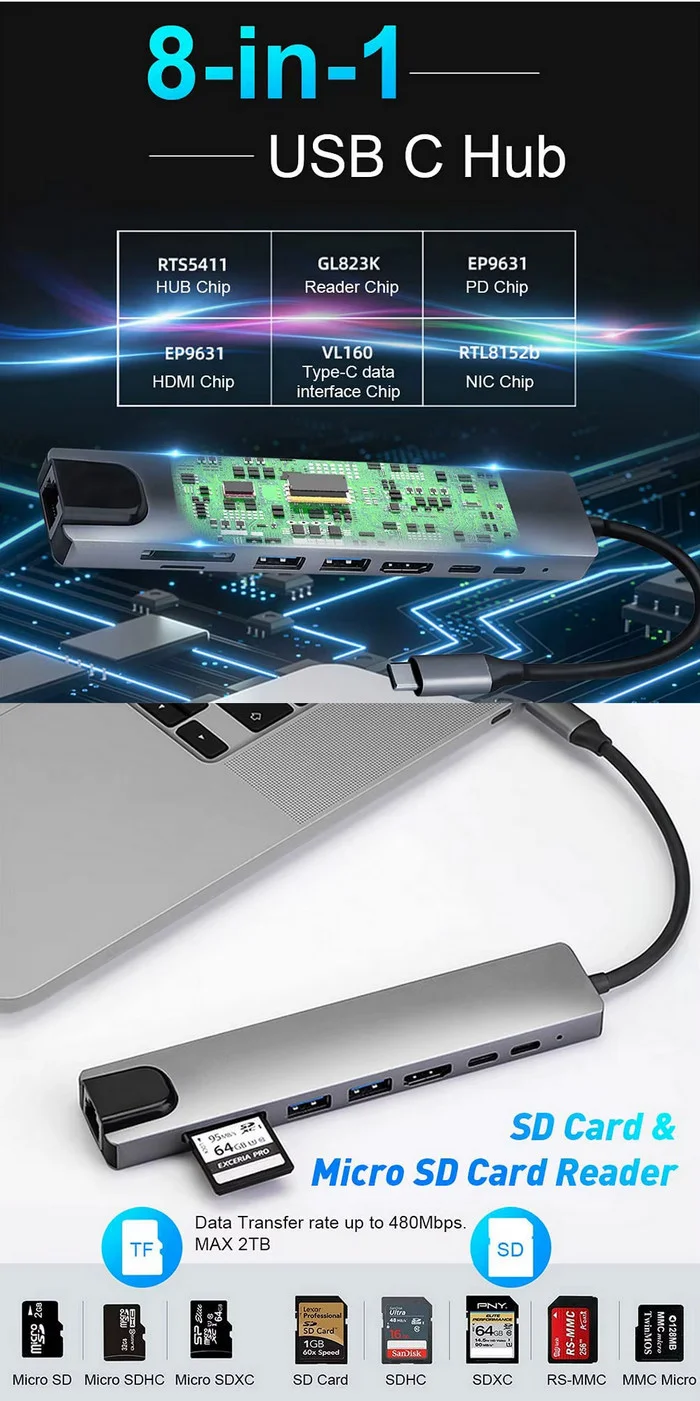 8in1 2*USB3.0 + 1*TF + 1*SD + 1*HDMI-compatible4k + 1*Rj45 100M + 1*USB-C PD port + 1* USB-C data port